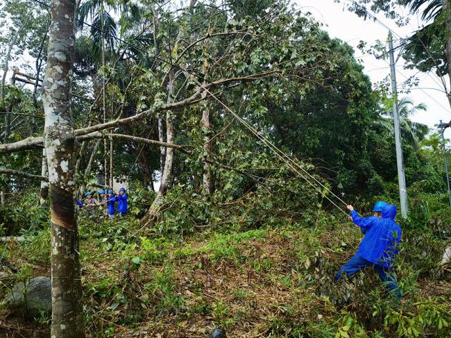到達(dá)海南后,揭陽明利綜合能源發(fā)展有限公司支援海南抗災(zāi)搶險隊在澄邁縣緊鑼密鼓開展搶修復(fù)電工作。澄邁地貌相對平整,但林區(qū)覆蓋率較高,橡膠林香蕉園廣泛分布,臺風(fēng)摩羯過境后,林區(qū)樹木倒塌壓垮電線,線路損壞嚴(yán)重。為打通線路搶修通道,加快復(fù)電進(jìn)度,公司搶險隊伍一邊組織大型施工機(jī)械快速重新組立電桿,一邊組織人員及時消缺搶修,力爭以最快速度恢復(fù)線路正常供電。